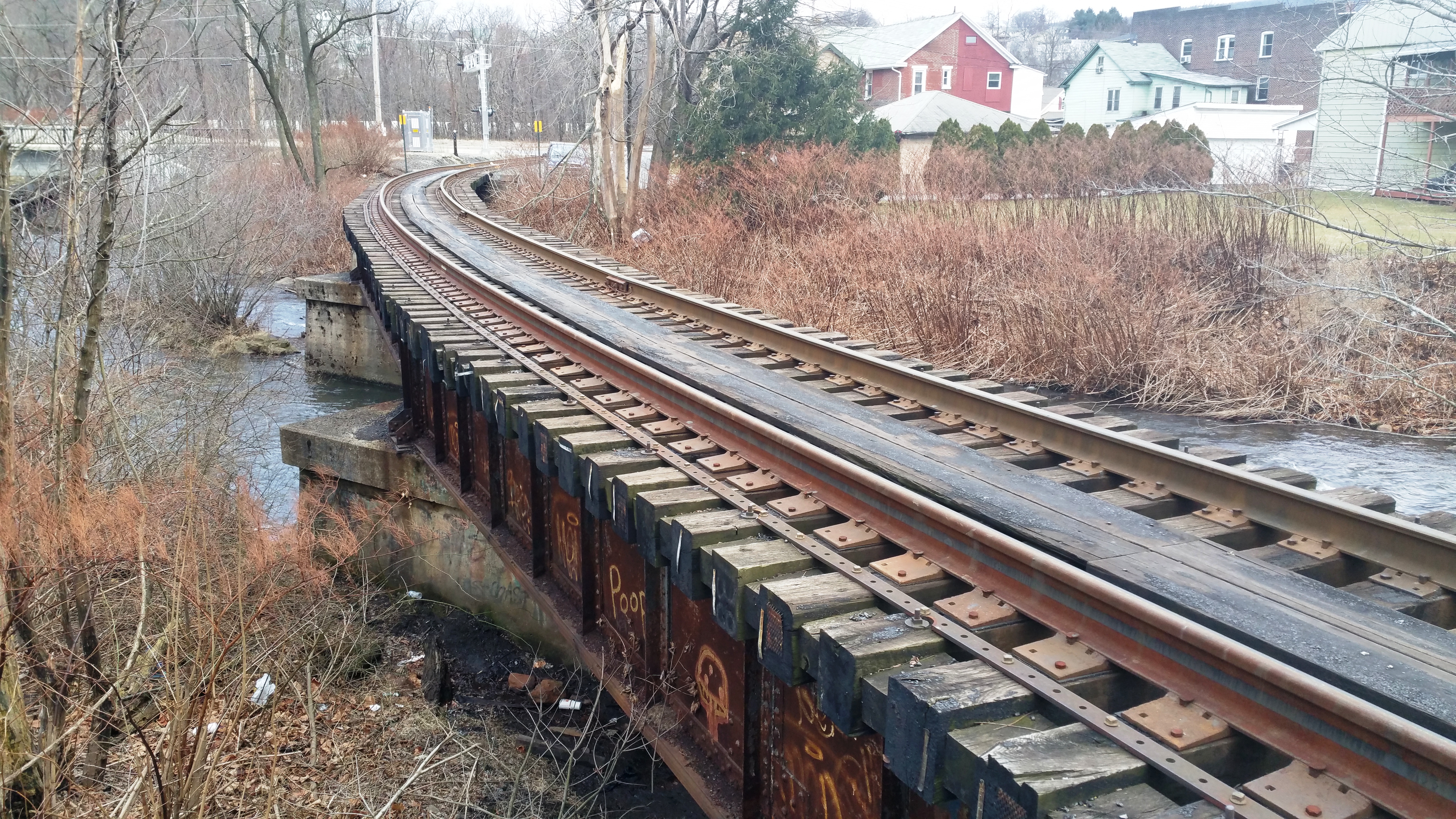 Pictured are two photos of the train trestle located at the south end of Tamaqua, along SR309.