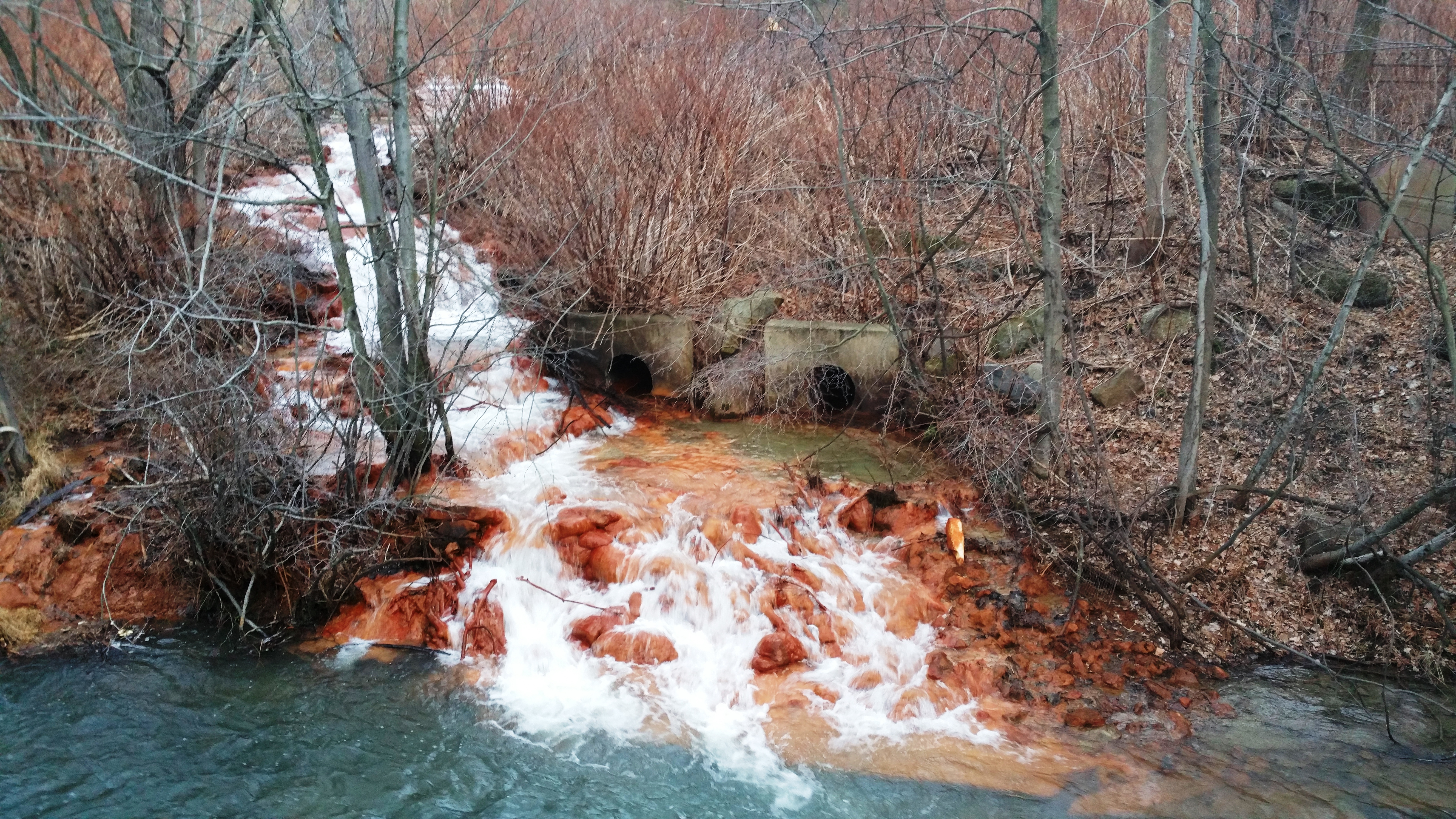 Pictured yesterday, is orange mine drainage runoff from the above treatment plant at the base of Mount Pisgah in the southeast section of Tamaqua. This has been like this since 2003, when the plant was built after the Department of Environmental Protection required Lehigh Coal and Navigation Company to reclaim former mine lands on the mountain. The draining water is mixed with lime, which results in an orange color from iron filtering out of the water.
