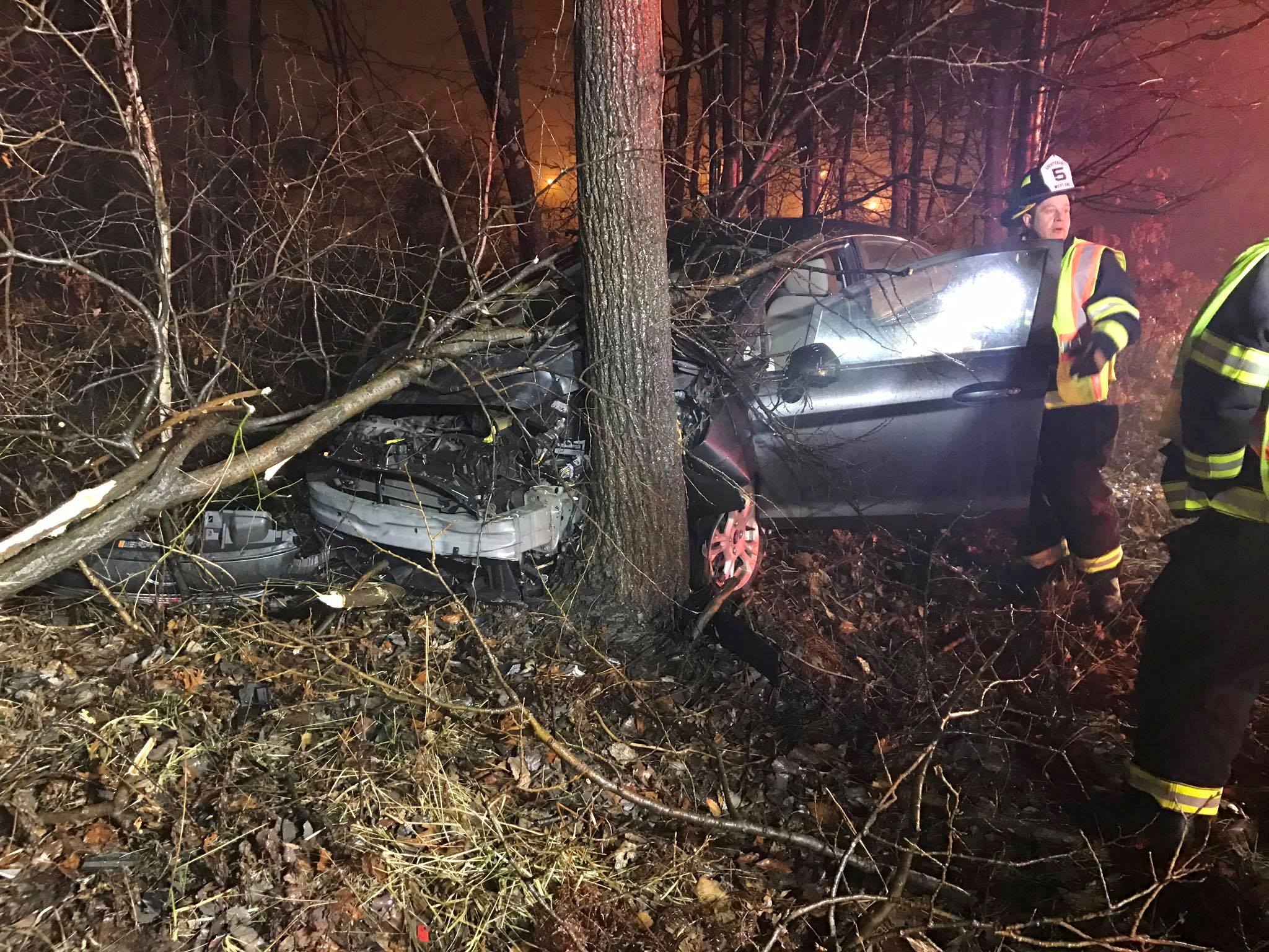 Reportedly, a car impacted a tree between Fabcon and Shell Gas Station.