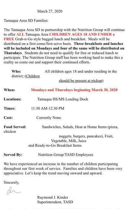 – March 17, 2020: PA Governor Wolf’s administration directs families to emergency food assiantance during COVID-19 mitigation; Provides useful links). (link) (self-declaration of need form).