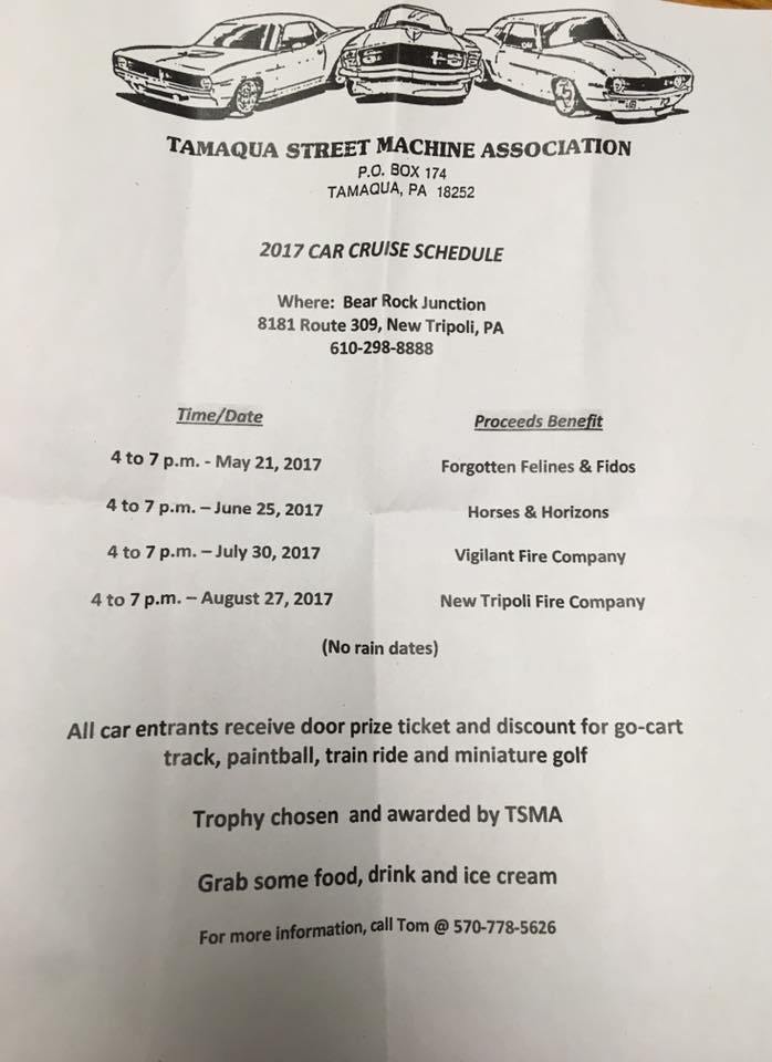 7-30, 8-27-2017, Car Cruise, Shows, via Tamaqua Street Machine Association, TSMA