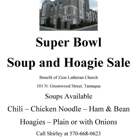 SUPER BOWL SOUP AND HOAGIE SALE AT ZION LUTHERAN CHURCH IN TAMAQUA; LAST DAY TO ORDER IS JANUARY 26