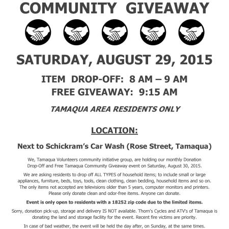 DONATION DROP-OFF AND FREE TAMAQUA COMMUNITY GIVEAWAY SET FOR SATURDAY, AUGUST 29