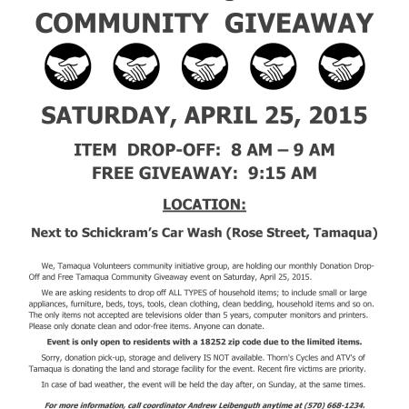VOLUNTEERS NEEDED SATURDAY MORNING FOR DONATION DROP-OFF AND FREE TAMAQUA COMMUNITY GIVEAWAY