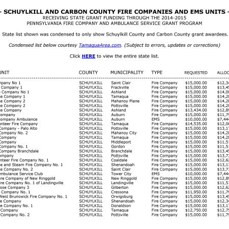 LIST OF SCHUYLKILL AND CARBON COUNTY FIRE COMPANIES AND E.M.S. UNITS TO RECEIVE STATE GRANT FUNDS