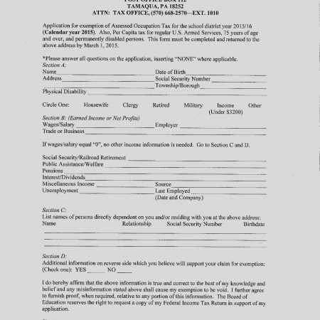 TAMAQUA AREA SCHOOL DISTRICT ACCEPTING TAX EXEMPTION APPLICATIONS; DUE NO LATER THAN MARCH 1
