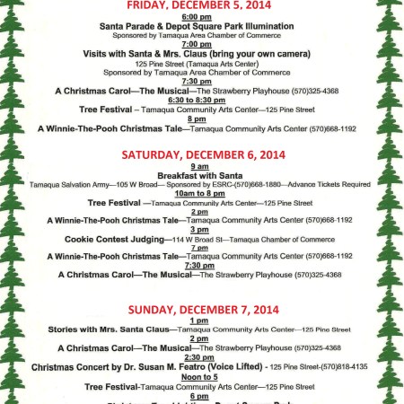 CHRISTMAS CONCERT, STORYTIME WITH MRS. CLAUS, TREE FESTIVAL, CHRISTMAS PLAYS, TREE LIGHTING IN AND AROUND TAMAQUA ON SUNDAY