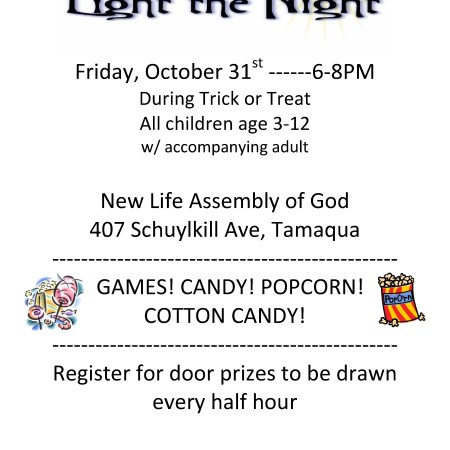 LIGHT THE NIGHT SAFE TRICK-OR-TREAT FRIDAY NIGHT AT NEW LIFE ASSEMBLY OF GOD; FOR KIDS AGES 3 TO 12
