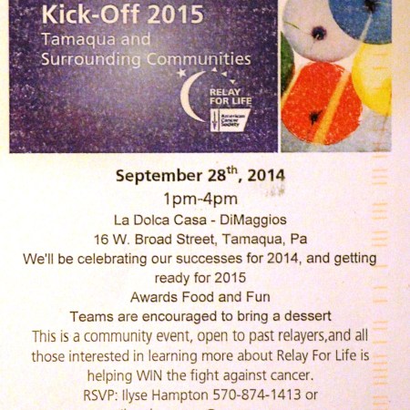 2015 TAMAQUA AREA RELAY FOR LIFE KICKOFF PARTY SUNDAY IN TAMAQUA; ALL ARE INVITED!