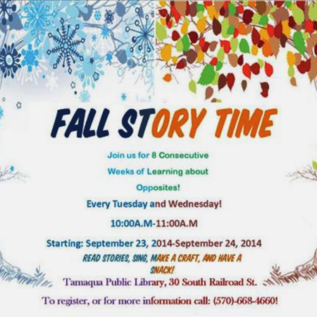 FALL STORY TIME AT TAMAQUA PUBLIC LIBRARY STARTS TUESDAY AND WEDNESDAY; (For ages 2 to 5)