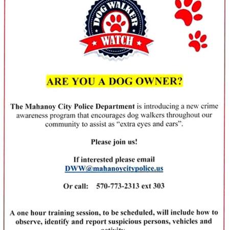 MAHANOY CITY POLICE INTRODUCE NEW CRIME WATCH AWARENESS PROGRAM; ‘DOG WALKER WATCH’