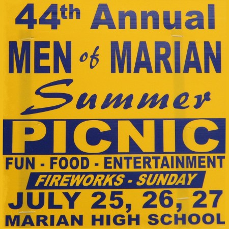 MEN OF MARIAN SUMMER PICNIC FRIDAY, SATURDAY AND SUNDAY AT MARIAN HIGH SCHOOL; FIREWORKS ON SUNDAY