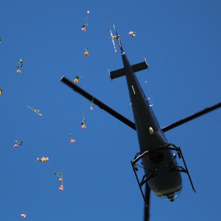 SHOWER OF ROSES HELD IN NEW COLUMBUS; 300 ROSES DROPPED FROM HELICOPTER