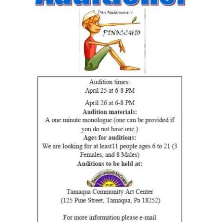 AUDITIONS FOR PINOCCHIO AT TAMAQUA COMMUNITY ARTS CENTER (April 25 & 26, 2015)