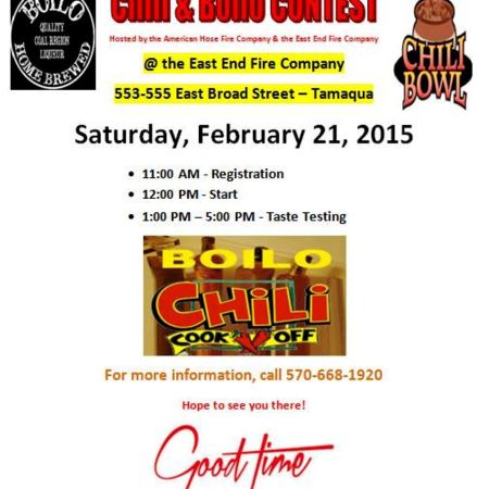 CHILI & BOILO CONTEST SATURDAY AT EAST END FIRE COMPANY IN TAMAQUA; BENEFITS A.C.S.